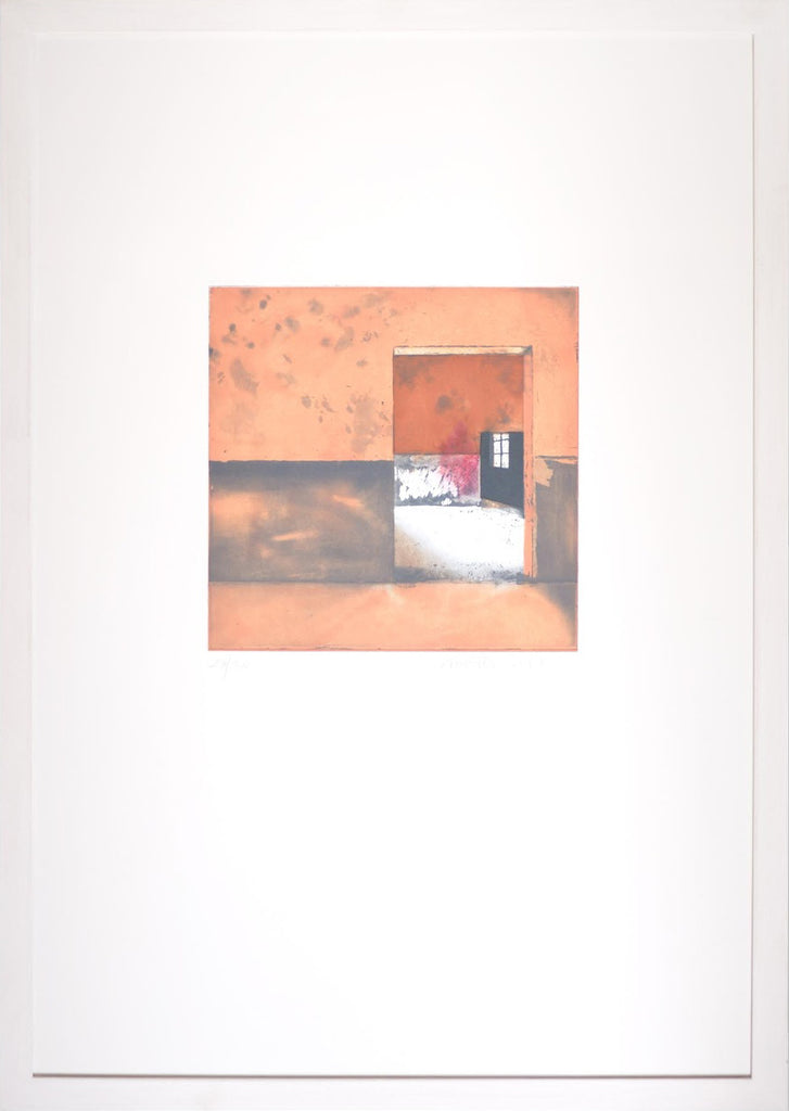 During his time in residency at Villa Lena, Nasr was struck by the likeness between the colours of the Villa itself and that of the sun-dried Egyptian architecture and earth. The perspective and depth conveyed by the print draw us in as viewers yet the piece is curtained by a red brushstroke.